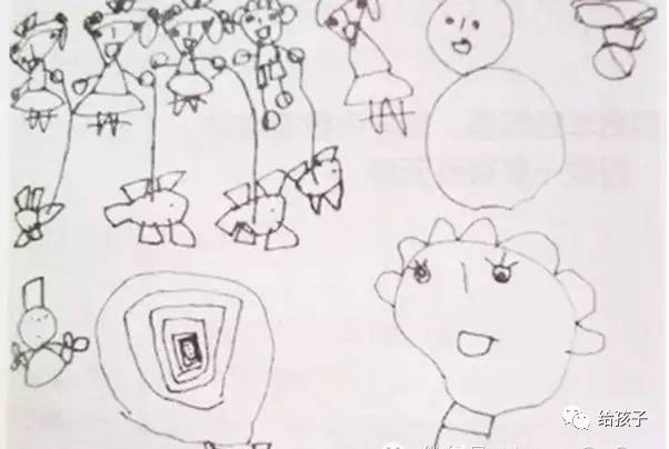 ps:四到八岁左右孩子绘画的特点不是按照自己看到的画,而是按照自己认识到的并且是感兴趣和关心的事物来画画。