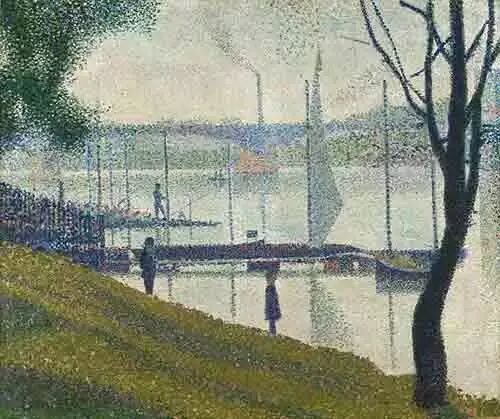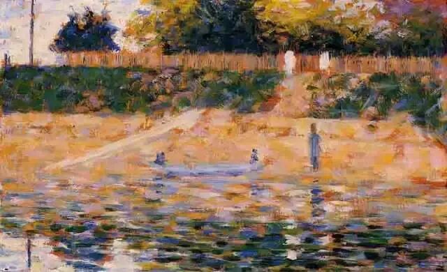 修拉在这幅画上选择了一个以工业区作背景的洗浴场面,