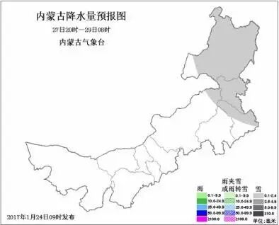27—29日,锡林郭勒盟东北部、通辽市北部和东部、兴安盟、呼伦贝尔市大部有小雪,累积降雪量在0~2.4毫米。