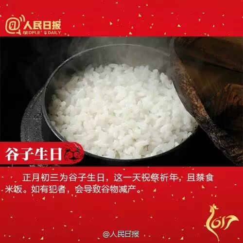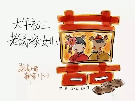 根据我国古代的传说,大年初三是“老鼠娶亲”的日子,所以相传入夜后,就必须早早熄灯就寝,让老鼠家族们举行婚礼,并在家中各处撒盐与米,意思是要与“老鼠分钱”。