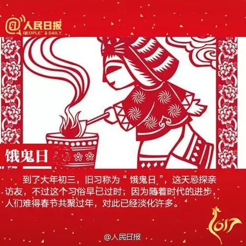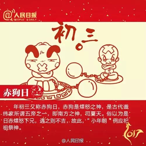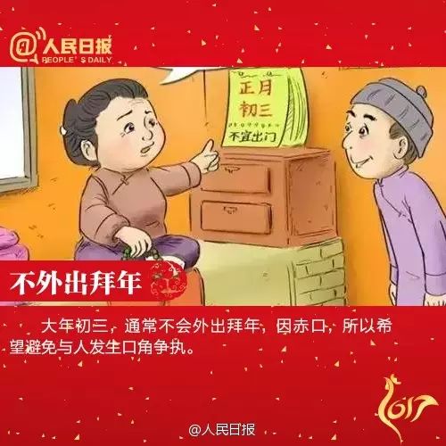 在中国南方,大年初三的早上要贴“赤口”(禁口),认为这一天里易生口角,不宜拜年。所谓“赤口”,一般是用约长七八寸、宽一寸的红纸条,上面写上一些出入平安吉利的话贴在前门和后门的门顶上,另外有一张是放在垃圾上面挑出外面倒掉。
