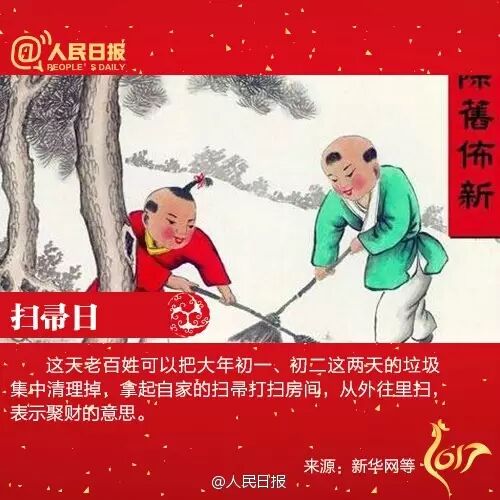 这些垃圾是初一初二两天积下来的,一定要到初三才一起清理倒掉,否则,等于把家中的金银财宝向外流一样。总之,贴“赤口”,是使人们心理上觉得一年到头都能出入平安,不与人发生口角或各种不幸的灾难,家中多多招财进宝,万事如意。