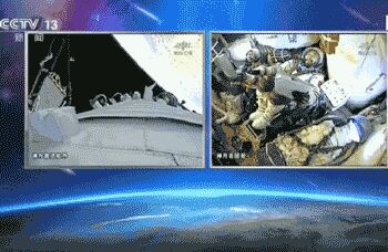 △太阳帆板打开后,两位航天员握手