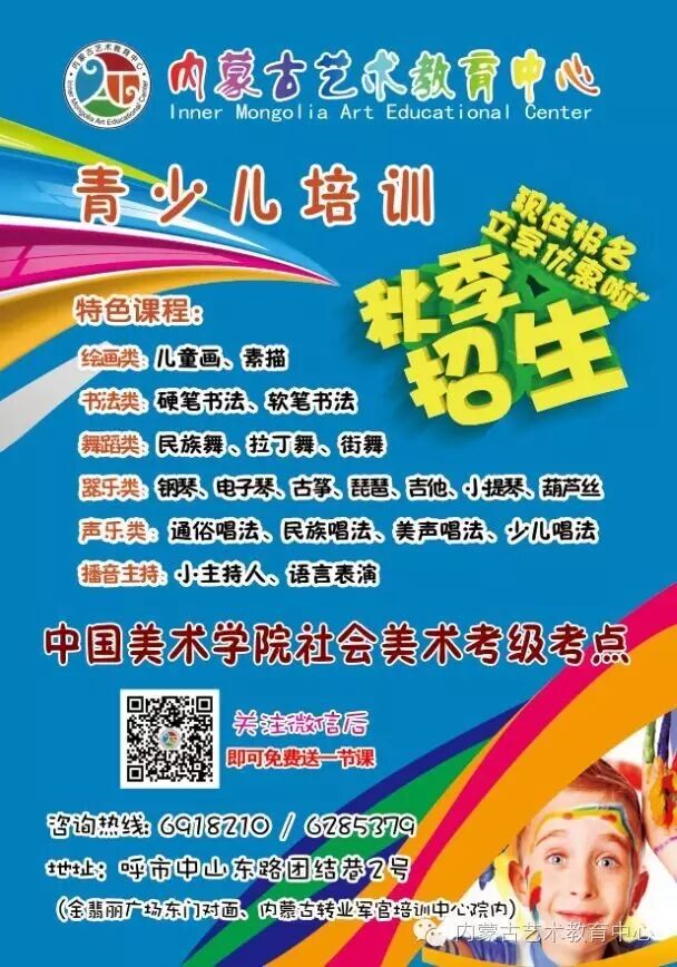 内蒙古艺术教育中心火热招募学员,关注我们,有更多惊喜!我们将会为您的孩子制定最合适的教学计划,让您的孩子真正爱上艺术。