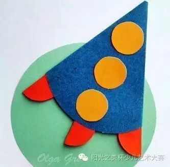蓝色圆卡纸折成一个扇形,再粘上红色圆卡纸做的火箭助推器,就可以准备发射啦!