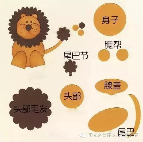用土黄色和褐色卡纸剪出图中的形状,然后粘成狮子的形状就好啦~