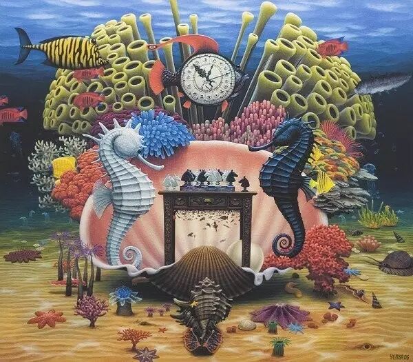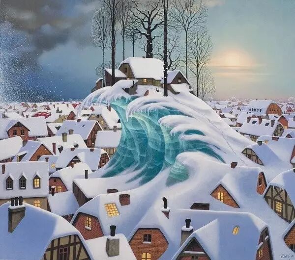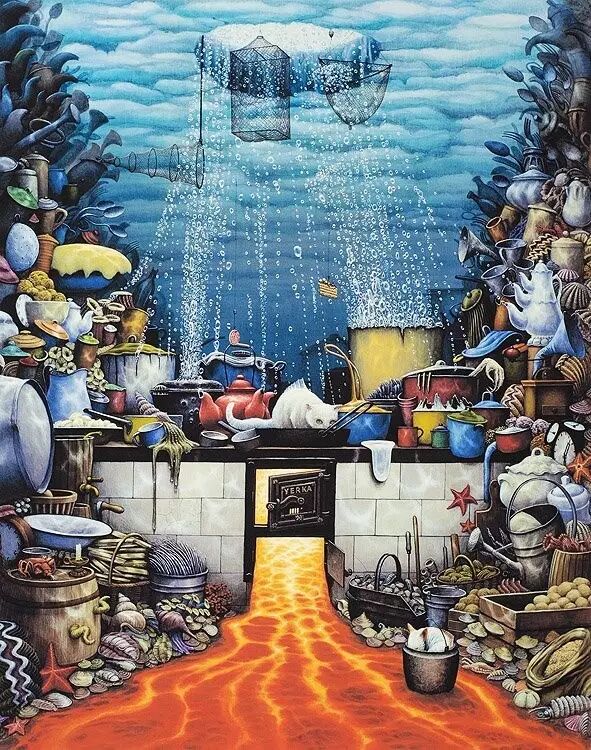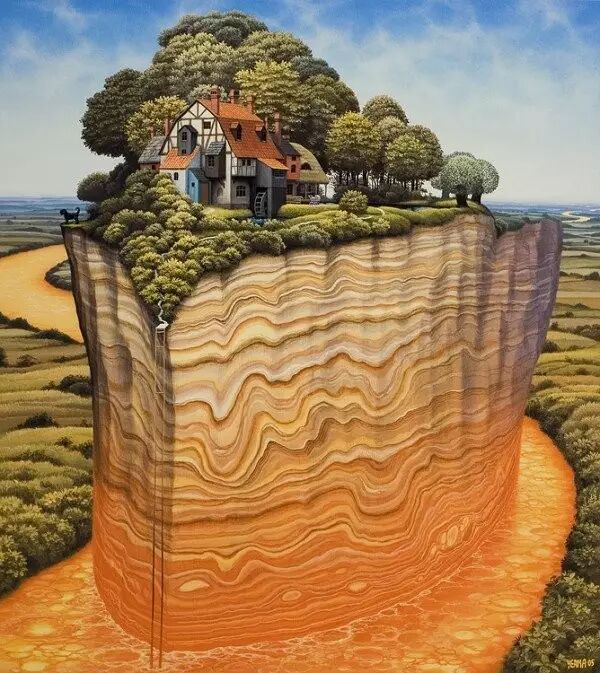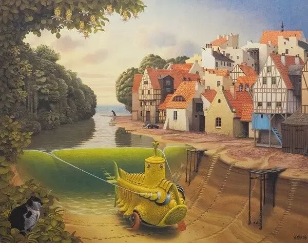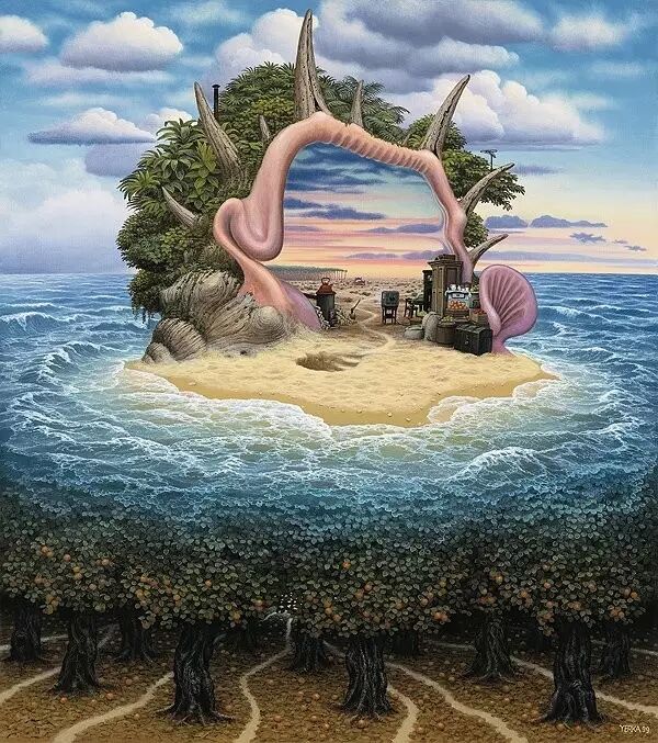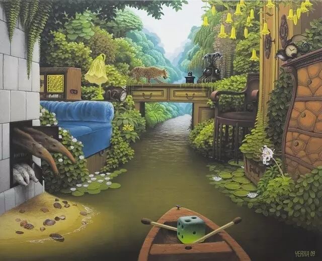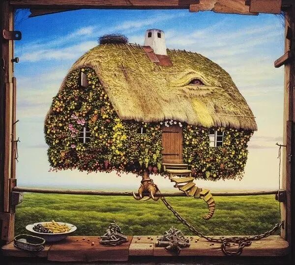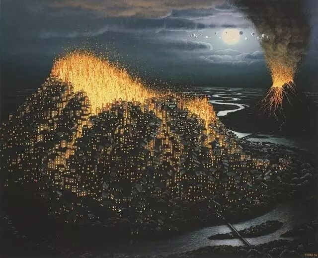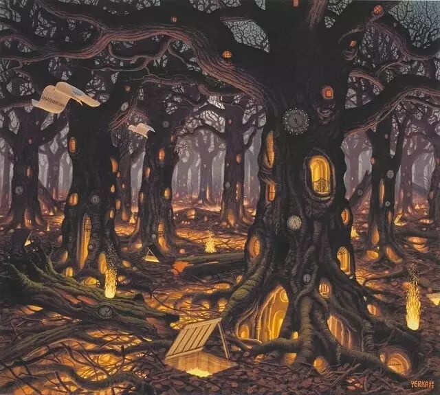 Jacek Yerka的画中,有鲜明的“与众不同”的东西,这个东西是一种宇宙哲学,融合了宗教与科学、悖论与奇幻、自然与机器、过去与未来,最关键的是,他的画中反复回旋着一种“家园”之感。在家园里,一个世界可能包含着另一个世界,一个世界可能威胁着另一个世界,一个世界可能期望着另一个世界,一个世界可能怀念另一个世界,一个世界可能基于另一个世界,一个世界可能飞向另一个世界……一个童话的甜美外壳,藏着神话的壮丽和恐怖。