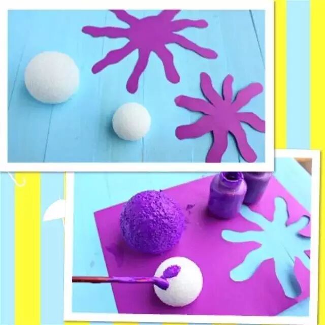 卡纸剪出八爪鱼的爪子,白纸揉成一个球后,涂上紫色颜料,风干后,粘一起即可~