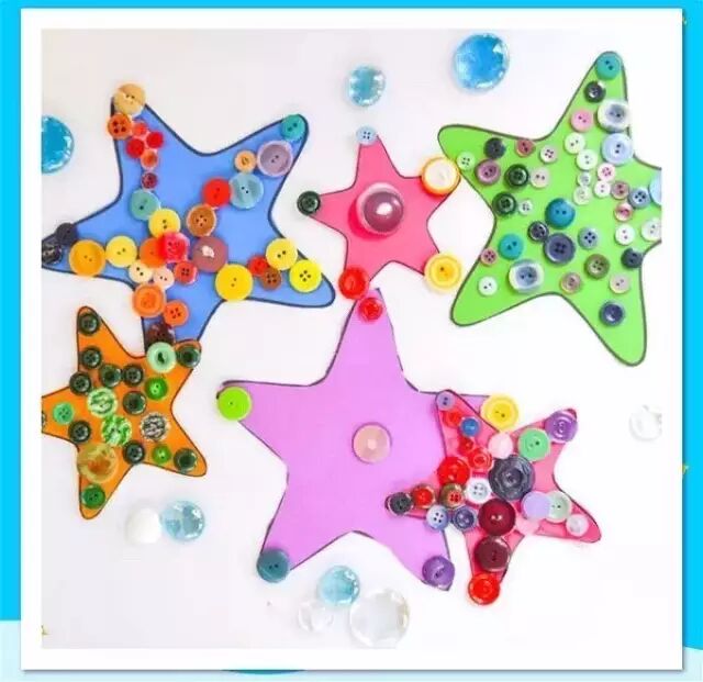 搭配五颜六色、大小各异的扣子,也可以增加卡纸海星的立体感哦~