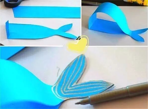 将两条长方形卡纸粘合在一起后,画出鲸鱼尾巴的纹路~这样小鲸鱼能更形象的哦~