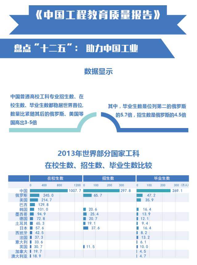 《中国工程教育质量报告》指出,“十二五”期间,中国工程教育主动“转型升级”,变革发展,建成了层次分明、类型多样、专业齐全、区域匹配的世界最大工程教育供给体系。数据显示,中国普通高校工科专业招生数、在校生数、毕业生数稳居世界首位,数量比紧随其后的俄罗斯、美国等国高出3-5倍。