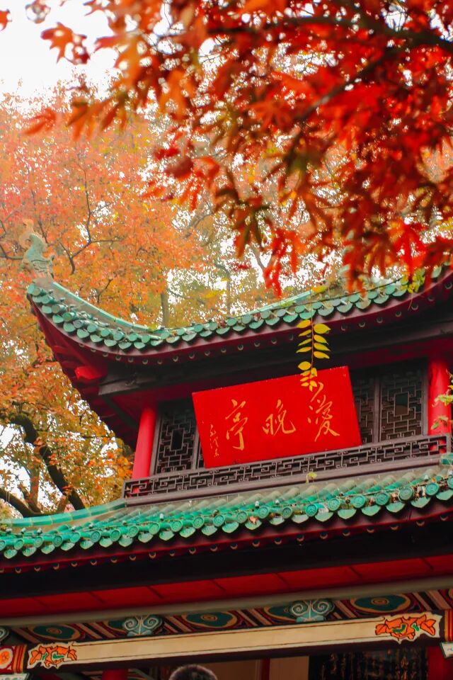 爱晚亭是岳麓山的一个重要景点,它与红叶渊源颇深。爱晚亭位于岳麓书院后青枫峡的小山上,八柱重檐,顶部覆盖绿色琉璃瓦,攒尖宝顶,内柱为红色木柱,外柱为花岗石方柱,天花彩绘藻井,蔚为壮观。