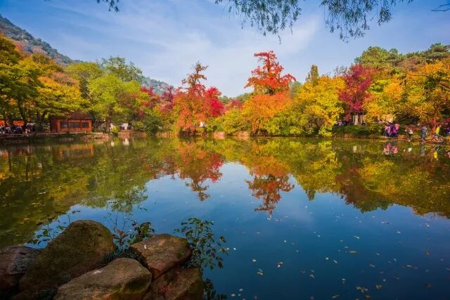 半山腰枫林上方的望枫台是最佳赏枫处。另外,从九曲桥上隔着一湖秋水观对面山上层层叠叠的红色,有一种宁静而不食人间烟火的感觉,也是不错的赏枫地。