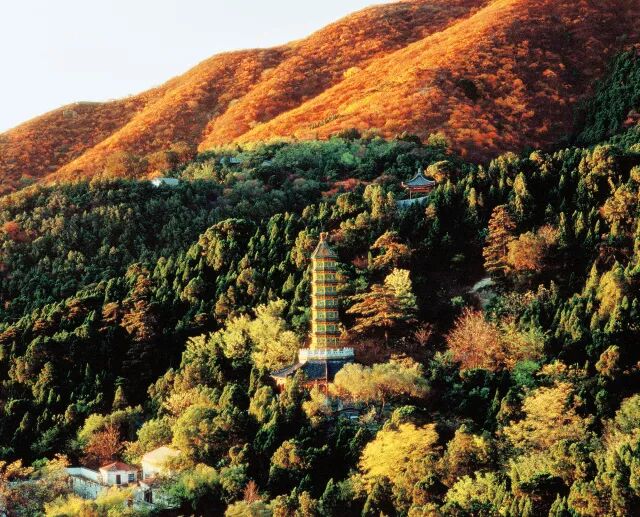 这里山峦叠嶂,层林尽染,殷红的黄栌与翠绿的松柏,交相辉映。而那掩映在万花丛中的琉璃塔,又为大气磅礴的山色,增添了几许人文的娇媚。