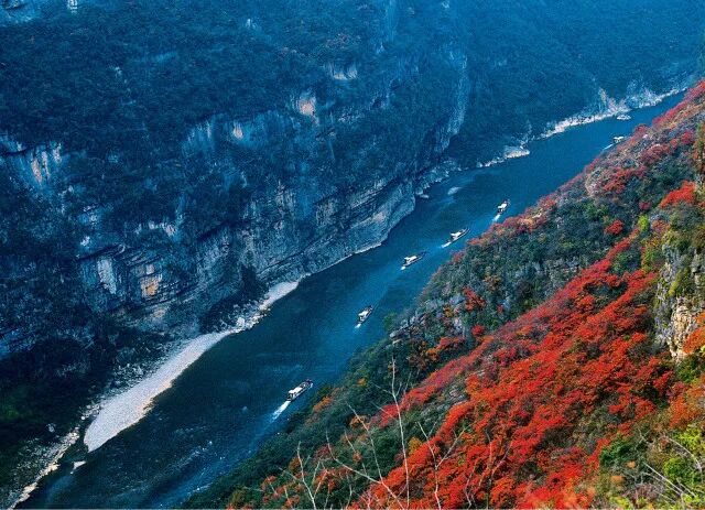 在长江的支流大宁河上,巴雾峡从开始到结束延伸了10公里,它的秋色也在峡谷两岸的岩壁上毫无遮拦地蔓延了10公里。