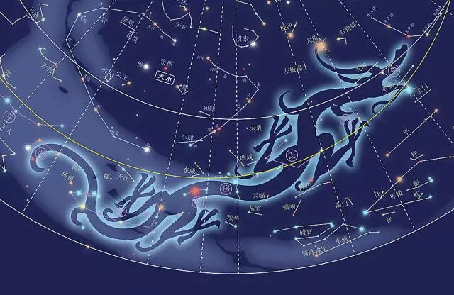二十八宿中的角、亢、氐、房、心、尾、箕七宿,组成一个完整的龙形星座,其中角宿恰似龙的角。