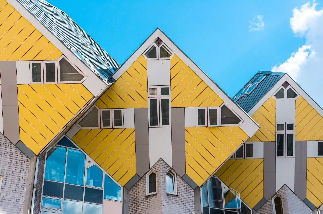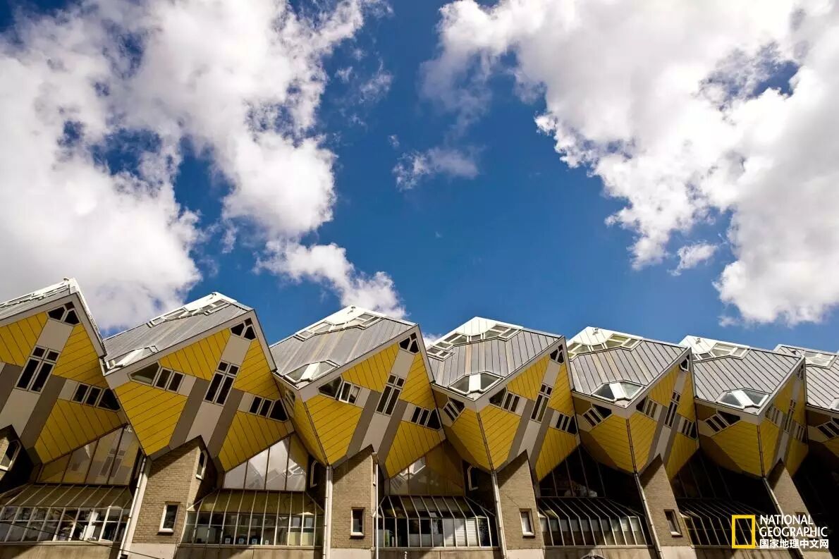 1977年,建筑师皮特•布洛姆设计这些方块屋时从一片树林那里获得了灵感。每个嫩黄色的方块向一侧倾斜45°,固定在一个六边形的塔架上,以此代表一棵树。