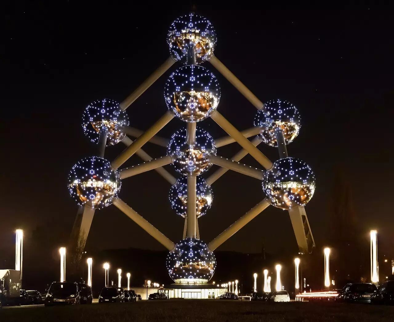 原子球塔最初是为了1958年的世界博览会而建,该塔由9个相互连接的球体组成,高102米。工程师André Waterkeyn和建筑师André、Jean Polak以铁原子结构为原型,将其放大1650亿倍之后便成了塔的真实尺寸,以此代表对科学进步的信心。